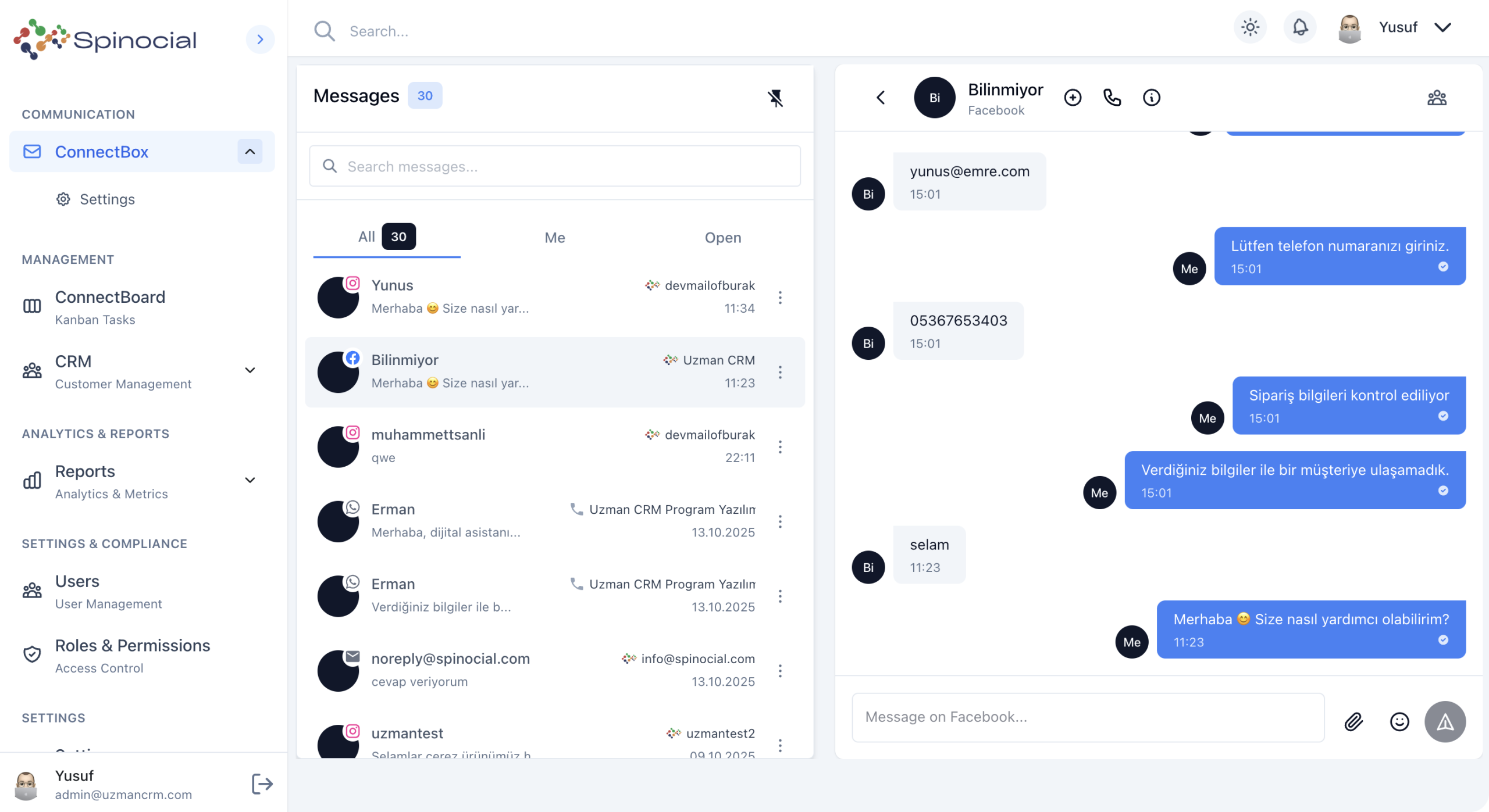 Spinocial, Whatsapp, Instagram, Facebook, Telegram, Tiktok, X, Şikayet var, Linkedin ve Google Pleaces mesajları ve yorumları gibi, her firmanın, her zaman düzenli olarak kontrol etmesi gereken bu kadar platformu tek yerden, en verimli şekilde yönetebilirsiniz.