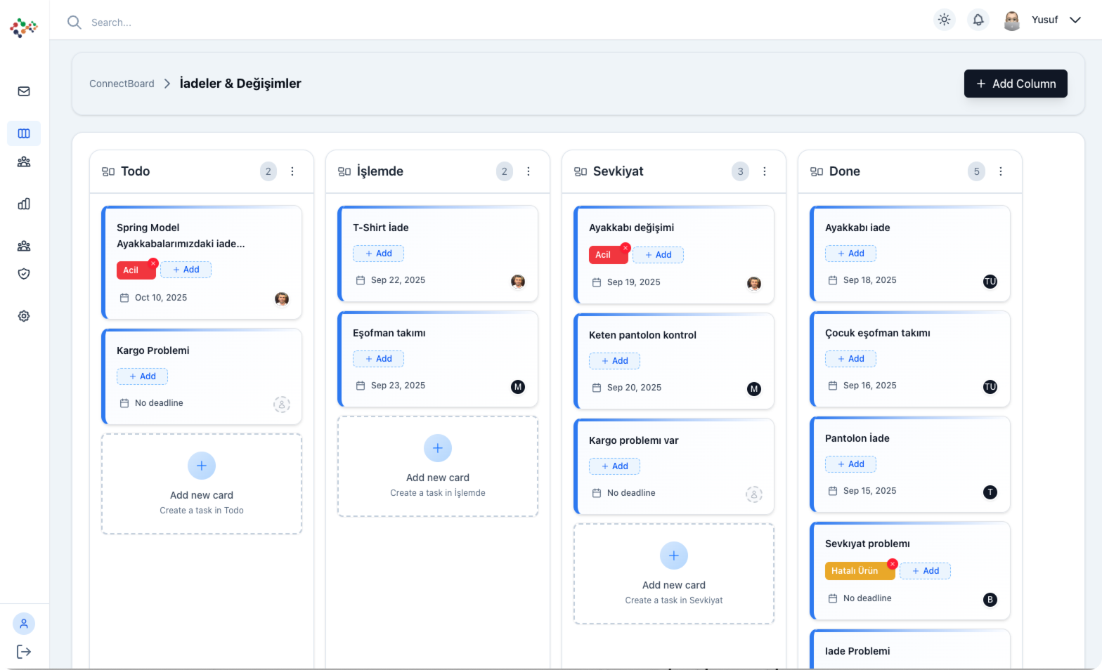 Spinocial içinde yer alan Kanban Tekniği ile iş süreçlerini yönetmenizi sağlayacak ConnectBoard ile hiçbir işinizi sahipsiz ve sonuçsuz bırakmayacaksınız.
