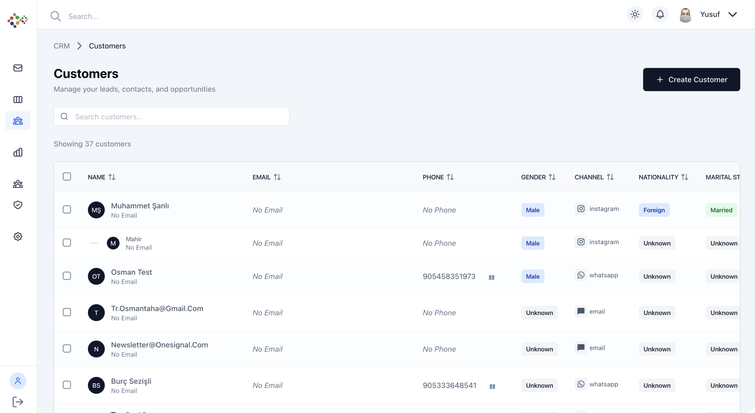 Spinocial içinde yer alan CRM modülümüz ile, sizinle yazışan tüm müşterilerinizi veya takipçilerinizi kişi kartları ile düzenleyebilir, birden fazla platformdan ulaşan aynı kişileri birleştirip düzenli hale getirebilir, kişilere gruplara ve segmentlere ayırarak daha kolay işlem yapabilir hale getirebilirsiniz.